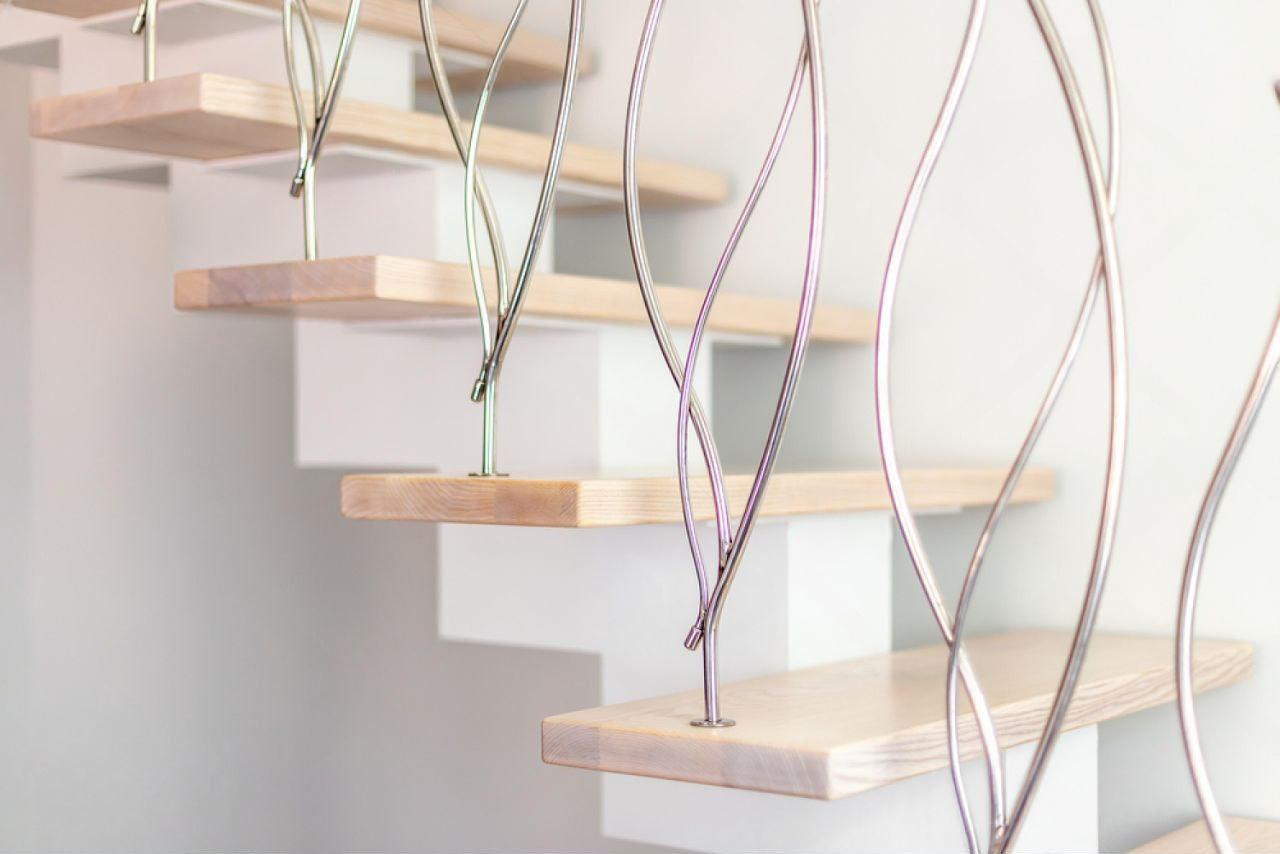 Основа композиции — белоснежный  бетонный монокосоур, который служит невидимой несущей осью и словно растворяется в пространстве. На нем, будто паря в воздухе, расположены ступени из натурального бука, которые привносят в интерьер тепло и природную текстуру. Особый шарм конструкции придает комбинированное ограждение: тактильно приятный деревянный поручень плавно переходит в лаконичные металлические основания, а тонкие фигурные стержни балясин с хромовым покрытием ловят блики света, добавляя динамики.