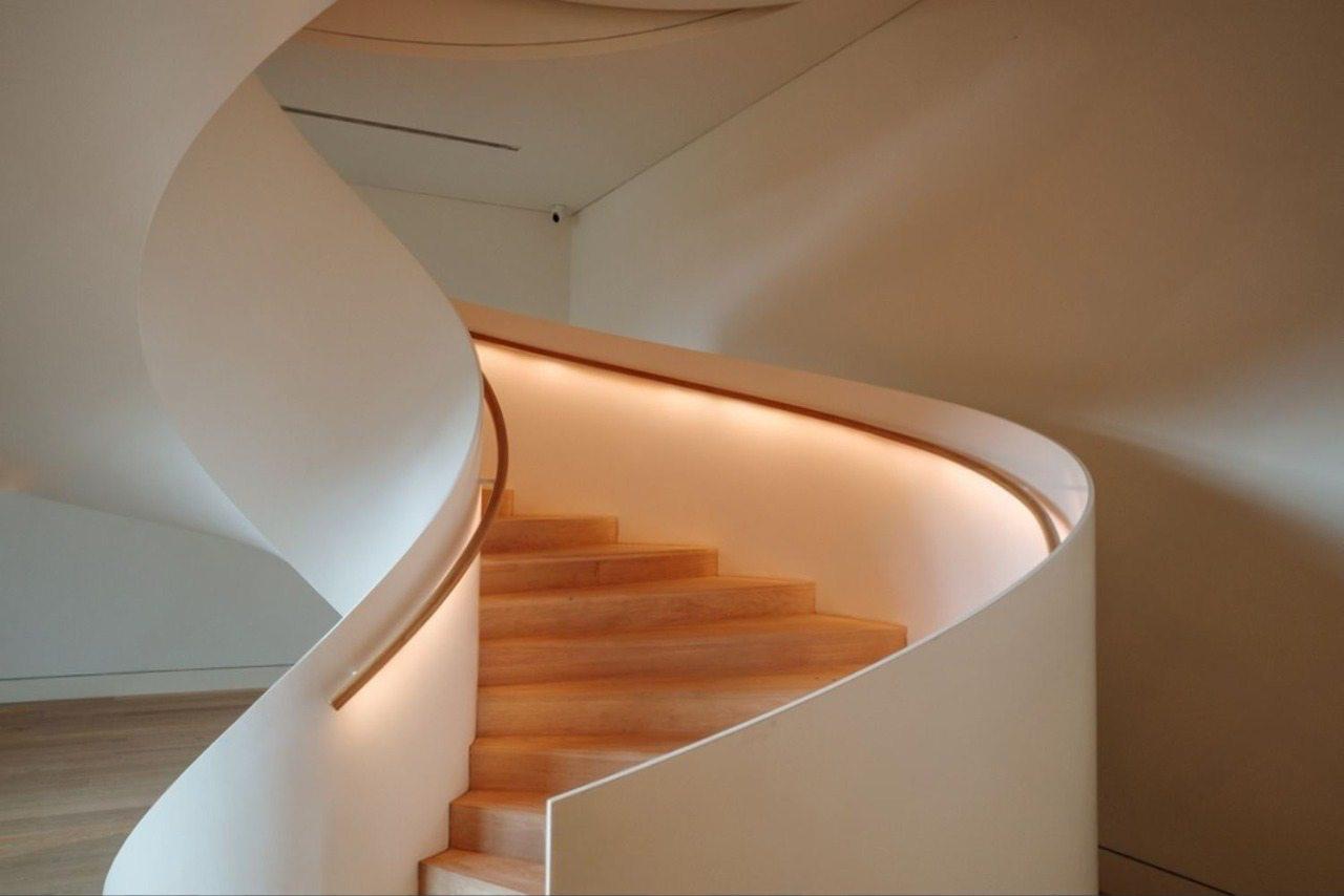 Полезный совет: Для настенной подсветки лестницы используйте точечные светильники с диммером. Это позволит вам регулировать яркость освещения: создавать приглушенную, уютную атмосферу вечером или включать более яркий свет для безопасного передвижения в темное время суток.