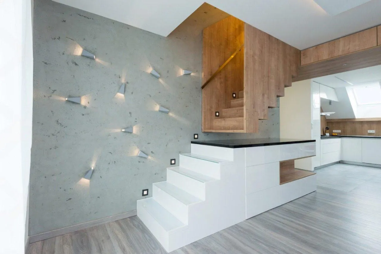 Идея для вашей лестницы: Интегрируйте в систему подсветки датчики движения. Свет будет плавно загораться, когда вы подходите к лестнице, и гаснуть после того, как вы пройдете. Это не только эффектно и современно, но и очень удобно в ночное время.